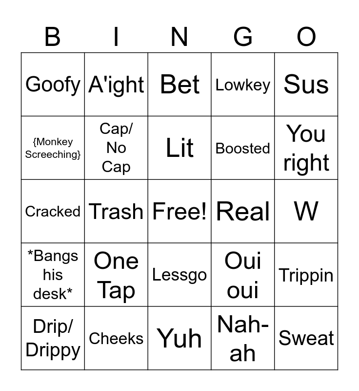 This bingo card has a free space and 38 words: Ayo, Facts, Bro/ Bruh, Cap/ No Cap, Trippin, One Tap, Lit, ACTUALLY, Sus, Boosted, Trash, Lowkey, Sweat, W, {Monkey Screeching}, *Bangs his desk*, On God, Bet, Blood, Real, Goofy, Cheeks, You right, Drip/ Drippy, Oof, Yuh, Wild, Booty, L, *Repeats phrase 3x*, That's so stupid, Lessgo, Nah-ah, A'ight, Tragic, Oui oui, Cracked and Hashtag.