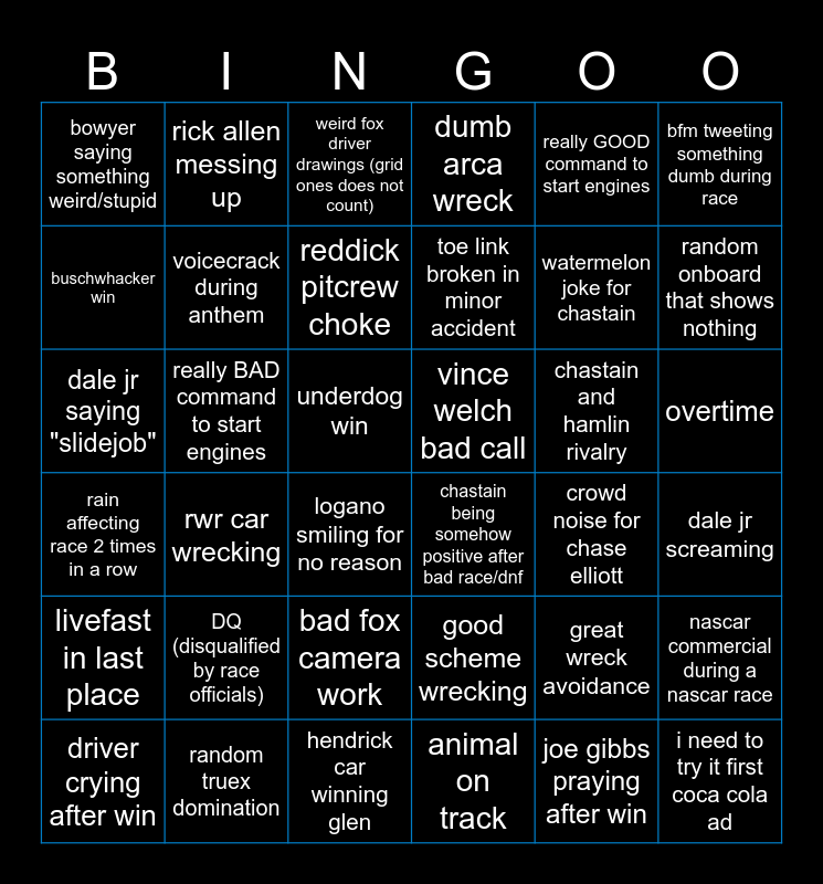 This bingo card has 49 words: commentators jinx, dale jr saying "slidejob", stupid penalty, crowd noise for chase elliott, chastain and hamlin rivalry, good scheme wrecking, rick allen messing up, wreck during commercial break, bfm tweeting something dumb during race, random truex domination, buschwhacker win, dumb arca wreck, rwr car wrecking, rain affecting race 2 times in a row, fox showing fans for no reason, bad fox camera work, voicecrack during anthem, really BAD command to start engines, ad during green flag (free space!), really GOOD command to start engines, random onboard that shows nothing, dale jr screaming, bowyer saying something weird/stupid, reddick pitcrew choke, mentions safer barrier during crash, toe link broken in minor accident, logano smiling for no reason, ugly scheme doing good, overtime, vince welch bad call, chastain move (i.e wallride, indy 22), DQ (disqualified by race officials), i need to try it first coca cola ad, wreck during driver interview, chastain being somehow positive after bad race/dnf, hendrick car winning glen, animal on track, joe gibbs praying after win, underdog win, driver crying after win, 1-3 caution race (stage does not count), great wreck avoidance, livefast in last place, red flag, watermelon joke for chastain, weird fox driver drawings (grid ones does not count), jimmie johnson wrecking :(, nascar commercial during a nascar race and popular song before they go to commercial.