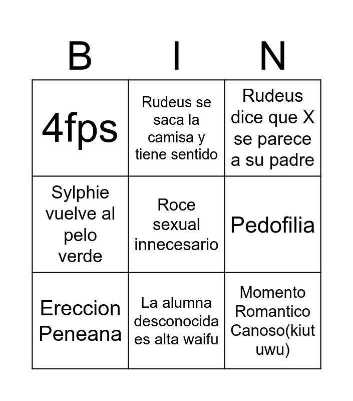 This bingo card has a free space and 8 words: Pedofilia, Rudeus dice que X se parece a su padre, Rudeus se saca la camisa y tiene sentido, Ereccion Peneana, 4fps, Momento Romantico Canoso(kiut uwu), Sylphie vuelve al pelo verde and La alumna desconocida es alta waifu.