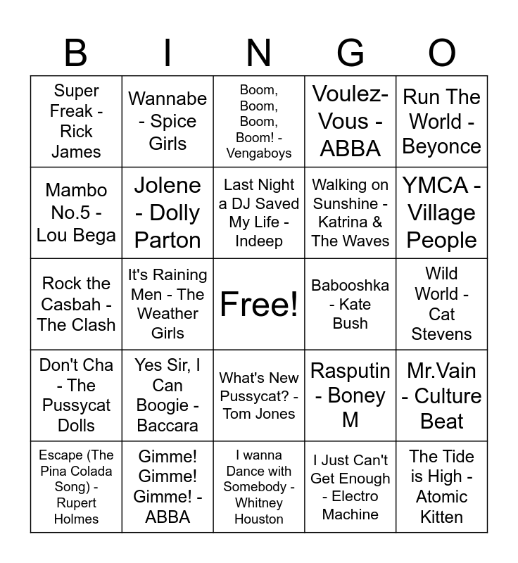 This bingo card has a free space and 40 words: Down Under - Luude, Colin Hay, Rock the Casbah - The Clash, Cool for Cats - Squeeze, Jolene - Dolly Parton, Gimme! Gimme! Gimme! - ABBA, What's New Pussycat? - Tom Jones, Last Night a DJ Saved My Life - Indeep, Firework - Katy Perry, Run The World - Beyonce, Don't Cha - The Pussycat Dolls, It's Raining Men - The Weather Girls, Voulez-Vous - ABBA, The Tide is High - Atomic Kitten, Wild World - Cat Stevens, Babooshka - Kate Bush, Yes Sir, I Can Boogie - Baccara, Like a Prayer - Madonna, Super Freak - Rick James, Believe - Cher, Boom, Boom, Boom, Boom! - Vengaboys, Mr.Vain - Culture Beat, I Just Can't Get Enough - Electro Machine, Walking on Sunshine - Katrina & The Waves, Mambo No.5 - Lou Bega, Uptown Girl - Billy Joel, Daddy Cool - Boney M, WAP - Cardi B, Megan Thee Stallion, Katy on a Mission - Katy B, Everybody Wants to be a Cat - Dimie Cat, Groove is in the Heart - Deee-Lite, Respect - Aretha Franklin, Escape (The Pina Colada Song) - Rupert Holmes, Praise You - Fatboy Slim, Rasputin - Boney M, YMCA - Village People, I wanna Dance with Somebody - Whitney Houston, Don't You Want Me - The Human League, One Way or Another - Blondie, Wannabe - Spice Girls and Hollaback Girl - Gwen Stefani.