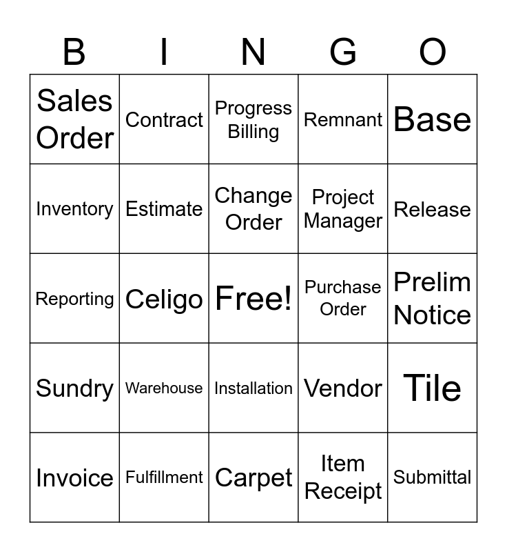 This bingo card has a free space and 29 words: Invoice, LVT, Celigo, San Diego, Sales Order, Progress Billing, Estimate, Warehouse, Purchase Order, Fulfillment, Prelim Notice, Submittal, Carpet, Item Receipt, Release, Customer, Installation, Sundry, Base, Reporting, Vendor, Coordinator, Project Manager, Inventory, Remnant, Contract, Tile, Change Order and Outlook.
