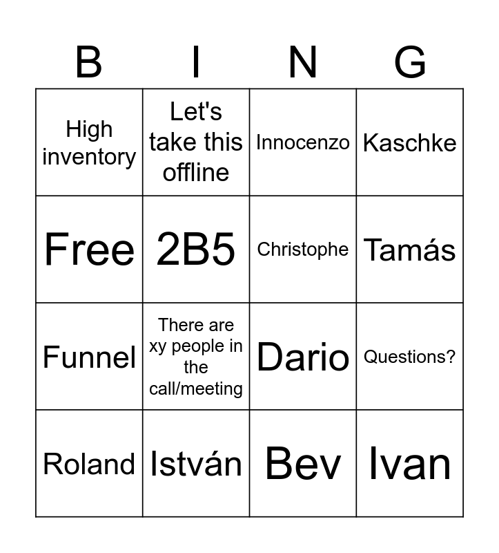 This bingo card has 16 words: Roland, István, Innocenzo, Kaschke, Free, Let's take this offline, Dario, Questions?, High inventory, 2B5, Bev, Tamás, Funnel, There are xy people in the call/meeting, Christophe and Ivan.