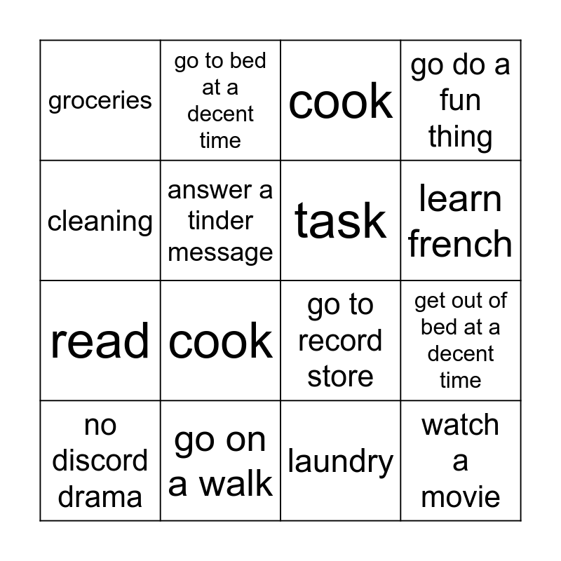 This bingo card has 16 words: go on a walk, get out of bed at a decent time, cook, groceries, read, go to bed at a decent time, go to record store, laundry, cleaning, answer a tinder message, no discord drama, go do a fun thing, cook, learn french, task and watch a movie.