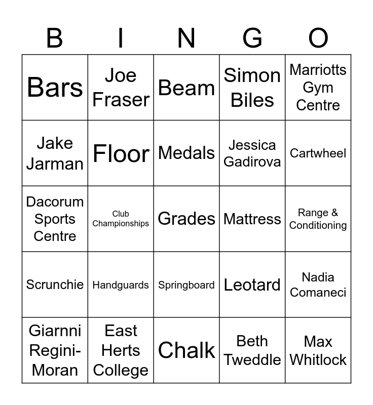 This bingo card has 30 words: East Herts College, Linda Taylor, Club Championships, Vault, Bars, Beam, Floor, Springboard, Mattress, Chalk, Range & Conditioning, Grades, Beth Tweddle, Max Whitlock, Cartwheel, Backflip, Leotard, Scrunchie, Handguards, Marriotts Gym Centre, Dacorum Sports Centre, Warm Up, Joe Fraser, Jessica Gadirova, Jake Jarman, Simon Biles, Nadia Comaneci, Giarnni Regini-Moran, Medals and Trophies.