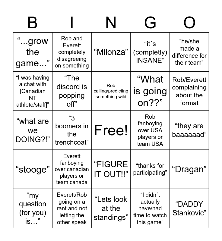 This bingo card has a free space and 41 words: someone mentions Brett Walsh, “what are we DOING?!”, Rob/Everett being disappointed, “The discord is popping off”, Everett/Rob going on a rant and not letting the other speak, “FIGURE IT OUT!!”, Rob calling/predicting something wild, “Are you kidding me?”, “he/she made a difference for their team”, “stooge”, “3 boomers in the trenchcoat”, “it´s (completly) INSANE”, “DADDY Stankovic”, “they are baaaaaad”, Rob fanboying over USA players or team USA, Everett fanboying over canadian players or team canada, “let´s jump right in”, “...grow the game...”, “listen to these numbers/quoting numbers/stats”, “Milonza”, “Dragan”, “We HAVE to talk about...”, “Lets look at the standings”, “What is going on??”, Everett cutting out, USAV slander, “I didn´t actually have/had time to watch this game”, “WHO CARES?!”, Rob/Everett complaining about the format, “3 dong”, “it´s ridiculous”, Rob and Everett completely disagreeing on something, “my question (for you) is…”, “there is not much to talk about”, “thanks for participating”, “I was having a chat with [Canadian NT athlete/staff]”, Everett bringing up NFL/NBA/MLB comparisons, “love that guy”, “I actually played against him in highschool”, Rob: “I hate soccer” and “homies(s)”.