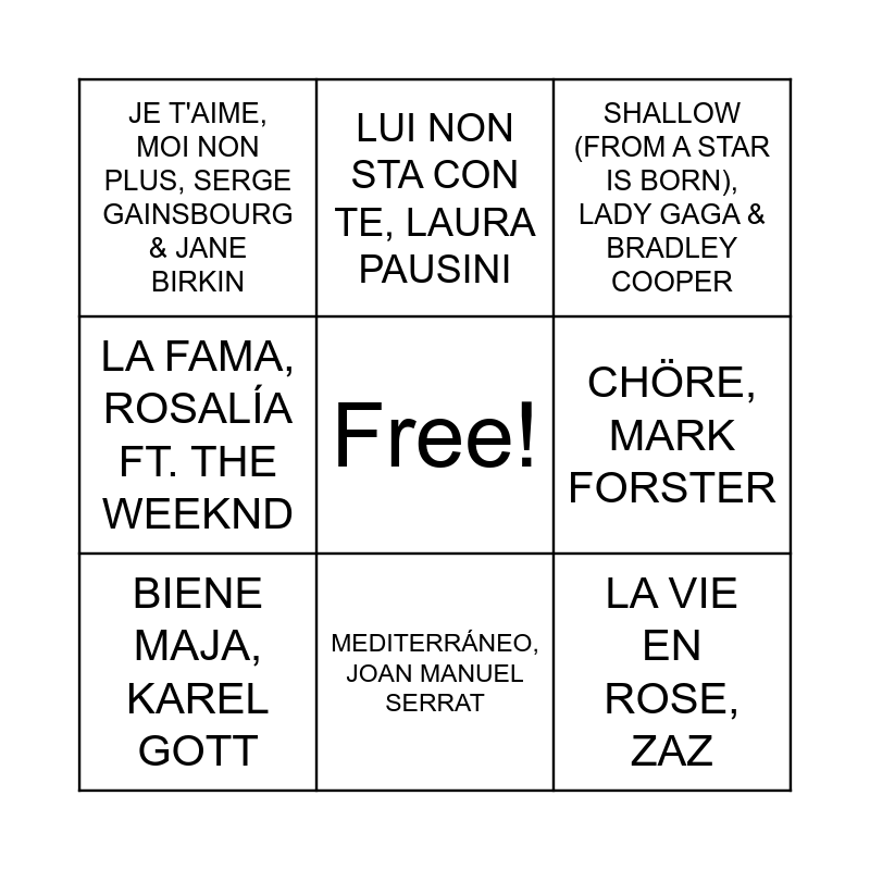 This bingo card has a free space and 20 words: I WANT TO BREAK FREE, QUEEN, RESPECT, ARETHA FRANKLIN, SHALLOW (FROM A STAR IS BORN), LADY GAGA & BRADLEY COOPER, BAD HABITS, ED SHEERAN, VOYAGE VOYAGE, DESIRELESS, LA VIE EN ROSE, ZAZ, ALORS ON DANSE, STROMAE, JE T'AIME, MOI NON PLUS, SERGE GAINSBOURG & JANE BIRKIN, ADESSO TU, EROS RAMAZOTTI, LUI NON STA CON TE, LAURA PAUSINI, UN´STORIA D´AMORE BUTTATA VIA, VASCO ROSSI, VOGLIO VEDERTI DANZARE, FRANCO BATTIATO, CHÖRE, MARK FORSTER, LIEBLINGSMENSCH, NAMIKA, BIENE MAJA, KAREL GOTT, DAS MODEL, KRAFTWERK, MEDITERRÁNEO, JOAN MANUEL SERRAT, LA FAMA, ROSALÍA FT. THE WEEKND, SIN DOCUMENTOS, LOS RODRÍGUEZ and MORENA MÍA, MIGUEL BOSÉ & JULIETA VENEGAS.