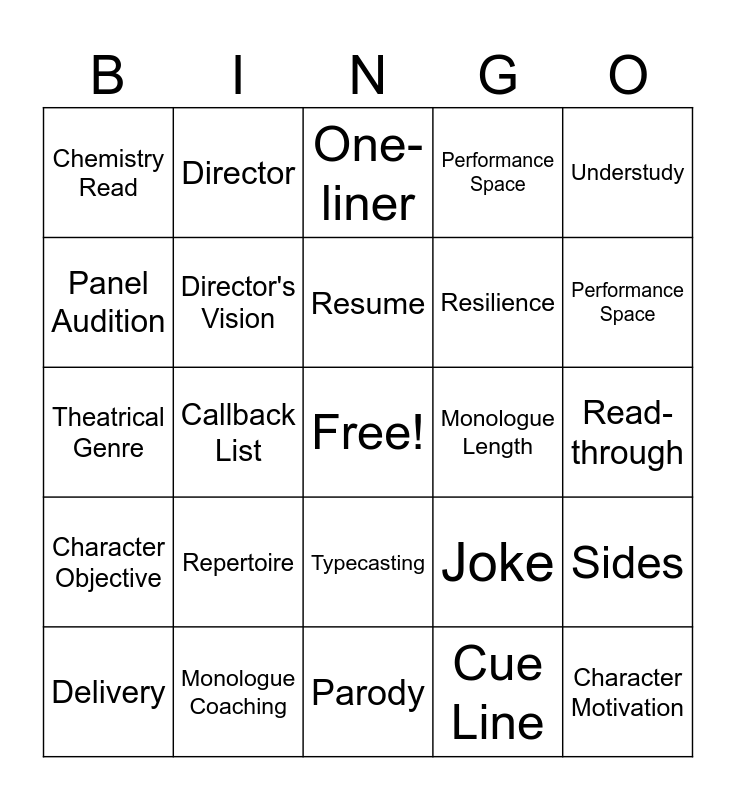This bingo card has a free space and 63 words: Audition, Monologue, Cold Reading, Sides, Callback, Casting Director, Director, Headshot, Resume, Character Breakdown, Typecasting, Blocking, Read-through, Understudy, Audition Etiquette, Panel Audition, Callback List, Chemistry Read, Range, Resilience, Repertoire, Character Objective, Performance Space, Callback Material, Preparation Time, Monologue, Soliloquy, Interior Monologue, Dramatic Monologue, Text Analysis, Character Development, Blocking, Audition Monologue, Characterization, Performance Space, Delivery, Memorization, Cue Line, Emotional Range, Director's Vision, Theatrical Genre, Monologue Length, Monologue Selection, Monologue Showcase, Character Motivation, Monologue Coaching, Humor, Joke, Punchline, Satire, Sarcasm, Parody, Slapstick, Gag, Deadpan, One-liner, Shtick, Stand-up, Timing, Comic Relief, Biting, Zany and Silly.