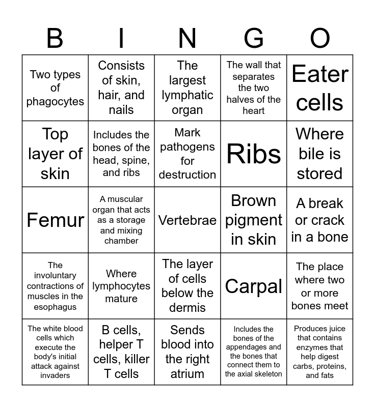 This bingo card has a free space and 24 words: Where lymphocytes mature, B cells, helper T cells, killer T cells, Mark pathogens for destruction, The white blood cells which execute the body's initial attack against invaders, Eater cells, Two types of phagocytes, Top layer of skin, Consists of skin, hair, and nails, Brown pigment in skin, The layer of cells below the dermis, Ribs, Femur, Carpal, The place where two or more bones meet, Includes the bones of the head, spine, and ribs, Includes the bones of the appendages and the bones that connect them to the axial skeleton, A break or crack in a bone, The largest lymphatic organ, Where bile is stored, A muscular organ that acts as a storage and mixing chamber, Produces juice that contains enzymes that help digest carbs, proteins, and fats, The involuntary contractions of muscles in the esophagus, The wall that separates the two halves of the heart and Sends blood into the right atrium.