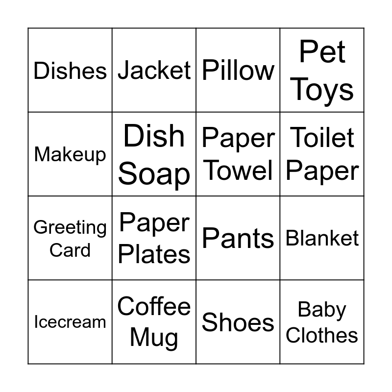 This bingo card has 16 words: Coffee Mug, Blanket, Pillow, Dishes, Greeting Card, Jacket, Pants, Shoes, Makeup, Dish Soap, Icecream, Pet Toys, Paper Plates, Toilet Paper, Paper Towel and Baby Clothes.