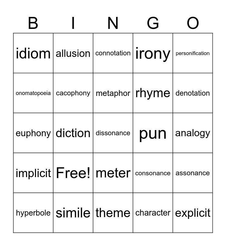 This bingo card has a free space and 24 words: Free!, simile, metaphor, hyperbole, personification, idiom, onomatopoeia, allusion, pun, meter, rhyme, euphony, consonance, assonance, cacophony, character, analogy, connotation, denotation, diction, explicit, implicit, irony and theme.