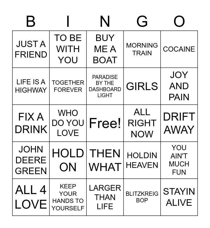 This bingo card has a free space and 49 words: YOU CAN LEAVE YOUR HAT ON, STAYIN ALIVE, GET READY, LARGER THAN LIFE, HOLD ON, WE'VE GOT IT GOIN ON, TO BE WITH YOU, ITS RAINING AGAIN, LIFE IS A HIGHWAY, GIRL YOU KNOW ITS TRUE, TOGETHER FOREVER, MORNING TRAIN, YOU AIN'T MUCH FUN, HOLDIN HEAVEN, OVER DRINKIN UNDER THINKIN, HEAD GAMES, PARADISE BY THE DASHBOARD LIGHT, ALL RIGHT NOW, LONG COOL WOMAN IN A BLACK DRESS, COCAINE, WHO DO YOU LOVE, BLITZKREIG BOP, JUST A FRIEND, GIRLS, WORD UP, JOY AND PAIN, ALL 4 LOVE, MERCURY BLUES, THEN WHAT, JOHN DEERE GREEN, MIRROR MIRROR, THE FIRST STEP, BIG TIME, FIRST TIME FOR EVERYTHING, KEEP YOUR HANDS TO YOURSELF, QUEEN OF HEARTS, THANK GOD I'M A COUNTRY BOY, I'VE BEEN EVERYWHERE, DRIFT AWAY, LOVE ON TOP, TIKTOK, NO SCRUBS, FERGALICIOUS, MY HUMPS, FIX A DRINK, BUY ME A BOAT, THE DEVIL WENT DOWN TO GEORGIA, LOVE SHACK and FRIENDS IN LOW PLACES.