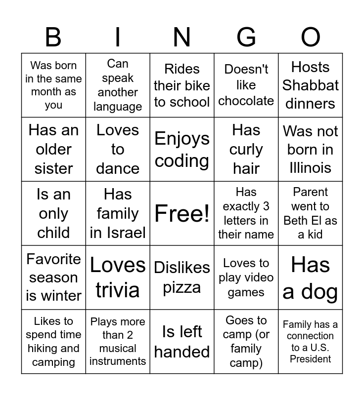 This bingo card has a free space and 24 words: Loves trivia, Plays more than 2 musical instruments, Enjoys coding, Likes to spend time hiking and camping, Hosts Shabbat dinners, Was born in the same month as you, Has an older sister, Can speak another language, Has exactly 3 letters in their name, Dislikes pizza, Has curly hair, Is an only child, Loves to play video games, Has a dog, Loves to dance, Goes to camp (or family camp), Parent went to Beth El as a kid, Rides their bike to school, Was not born in Illinois, Has family in Israel, Family has a connection to a U.S. President, Favorite season is winter, Doesn't like chocolate and Is left handed.