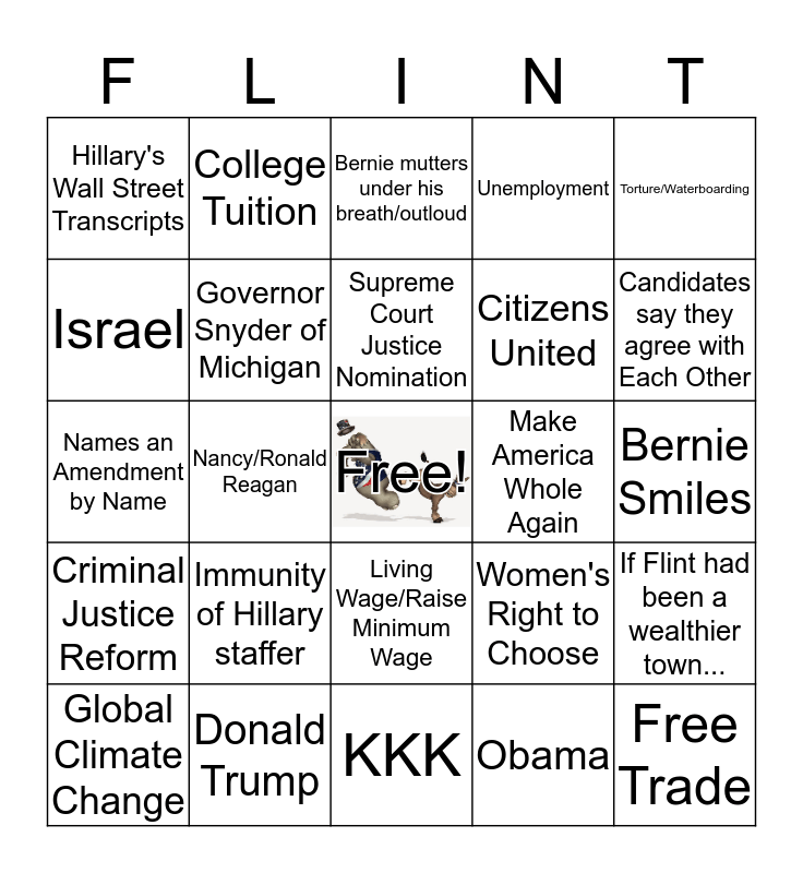 This bingo card has a free space and 24 words: Immunity of Hillary staffer, Donald Trump, Supreme Court Justice Nomination, Global Climate Change, Torture/Waterboarding, Hillary's Wall Street Transcripts, Israel, College Tuition, Make America Whole Again, Living Wage/Raise Minimum Wage, Citizens United, Names an Amendment by Name, Women's Right to Choose, If Flint had been a wealthier town..., Governor Snyder of Michigan, Obama, Bernie Smiles, Bernie mutters under his breath/outloud, Candidates say they agree with Each Other, Nancy/Ronald Reagan, Free Trade, Criminal Justice Reform, Unemployment and KKK.