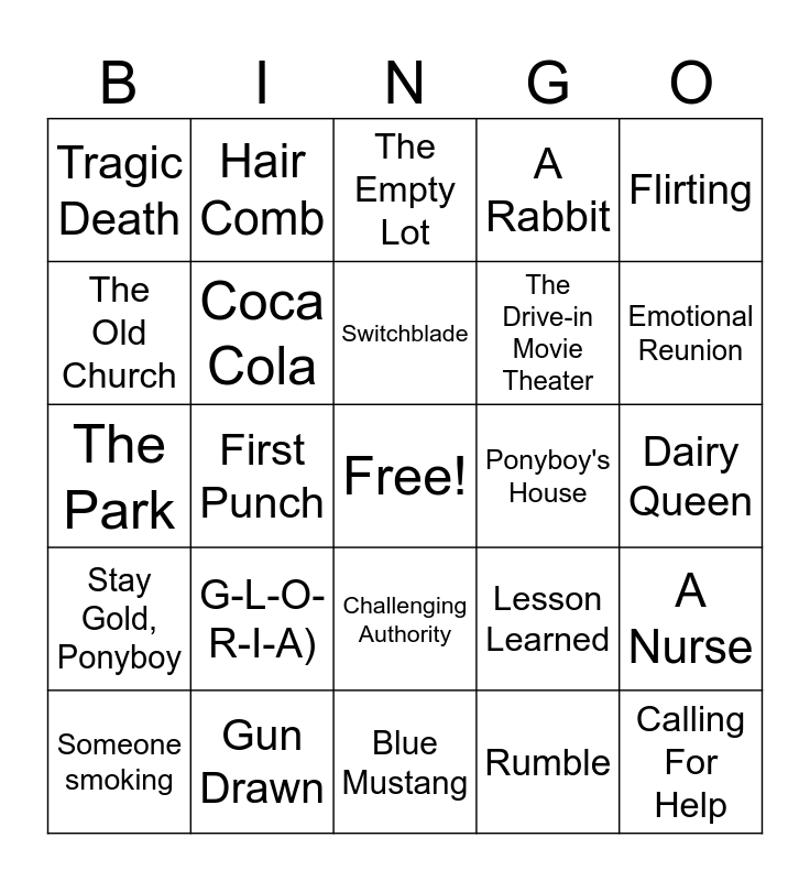 This bingo card has a free space and 24 words: G-L-O-R-I-A), Gun Drawn, Switchblade, Someone smoking, Flirting, Tragic Death, The Old Church, Hair Comb, Ponyboy's House, Challenging Authority, The Drive-in Movie Theater, The Park, Lesson Learned, A Nurse, Coca Cola, Rumble, Dairy Queen, The Empty Lot, Emotional Reunion, First Punch, Calling For Help, Stay Gold, Ponyboy, A Rabbit and Blue Mustang.