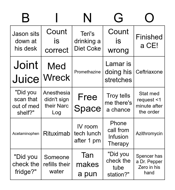 This bingo card has a free space and 29 words: "Did you check the fridge?", "Can you send a med request?", Anesthesia didn't sign their Narc Log, Ibuprofen, Jason sits down at his desk, Teri's drinking a Diet Coke, Med Wreck, Rituximab, Troy tells me there's a chance, Someone refills their water, Stat med request <1 minute after the order, Spencer has a Dr. Pepper Zero in his hand, Tan makes a pun, "Did you check the tube station?", Ceftriaxone, "Did we already send that?", IV room tech lunch after 1 pm, Acetaminophen, Finished a CE!, "Did you scan that out of med shelf?", Phone call from Infusion Therapy, Cefazolin, Lamar is doing his stretches, Joint Juice, Count is wrong, Count is correct, Azithromycin, Promethazine and Bupivacaine.