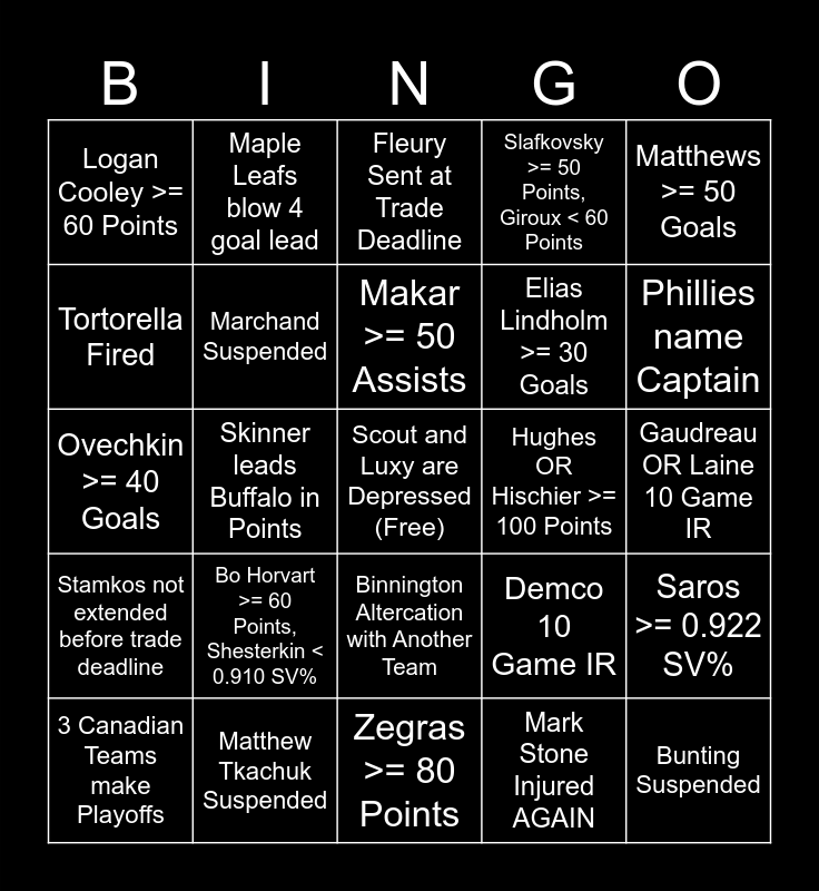 This bingo card has a free space and 41 words: McDavid & Draisaitl >= 110 Points, Ovechkin >= 40 Goals, Bedard >= 70 Points, Marchand Suspended, Matthew Tkachuk Suspended, Binnington Altercation with Another Team, Makar >= 50 Assists, Crosby hits 1000 Career Assists, Matthews >= 50 Goals, Stamkos not extended before trade deadline, Skinner leads Buffalo in Points, Slafkovsky >= 50 Points, Giroux < 60 Points, Bunting Suspended, Gaudreau OR Laine 10 Game IR, Hughes OR Hischier >= 100 Points, Bo Horvart >= 60 Points, Shesterkin < 0.910 SV%, Hart < 3.00 GAAA, Logan Cooley >= 60 Points, Robertson >= 100 Points, Fleury Sent at Trade Deadline, Saros >= 0.922 SV%, Scheifele >= 80 Points, Zegras >= 80 Points, Elias Lindholm >= 30 Goals, Dubois Leads Preds in Points, Shane Wright >= 50 Games, Mark Stone Injured AGAIN, Sharks retire Thornton's Number, Phillies name Captain, Canadiens buy Goalie at Deadline, Detroit OR Buffalo makes Playoffs, Maple Leafs blow 4 goal lead, 3 Canadian Teams make Playoffs, Team Retaliates against Promo Jersey Ban, Demco 10 Game IR, Tortorella Fired, Kicked in Goal Counts, Player Suspended 5+ Games, NHL Team Fined for Non-Player/Off-Ice Incident, Bally Sports Loses Rights and Tkachuk Fight..