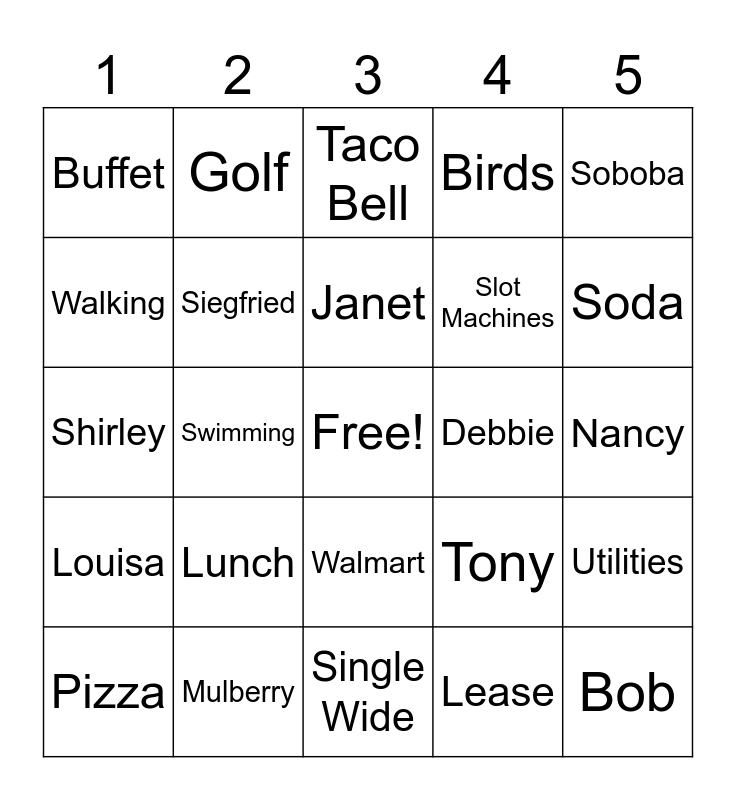 This bingo card has a free space and 24 words: Pizza, Lunch, Janet, Lease, Soboba, Buffet, Golf, Taco Bell, Debbie, Nancy, Shirley, Siegfried, Tony, Utilities, Walking, Mulberry, Single Wide, Birds, Soda, Louisa, Swimming, Walmart, Slot Machines and Bob.