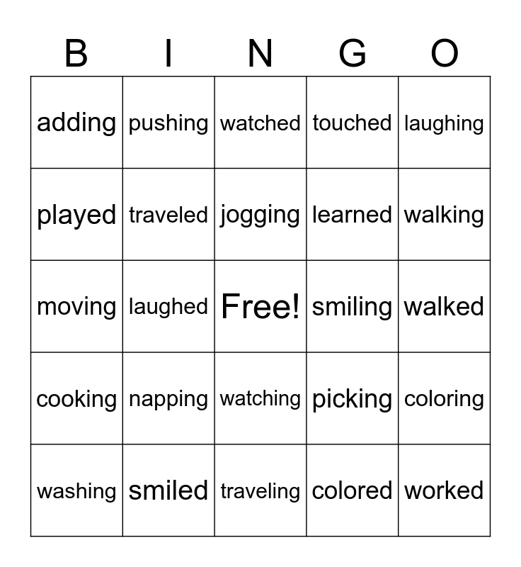 This bingo card has a free space and 42 words: jogged, jogging, napped, napping, colored, coloring, worked, working, watched, watching, walked, walking, laughed, laughing, picked, picking, moved, moving, pushed, pushing, played, playing, added, adding, talked, talking, learned, learning, looked, looking, cooked, cooking, traveled, traveling, washed, washing, smiled, smiling, asked, asking, touched and touching.