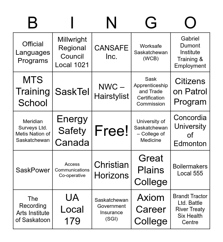 This bingo card has a free space and 42 words: NWC – Recruitment, NWC – Hairstylist, NWC – HETTT, Access Communications Co-operative, Axiom Career College, Boilermakers Local 555, Brandt Tractor Ltd. Battle River Treaty Six Health Centre, Canadian Armed Forces, CANSAFE Inc., Christian Horizons, Concordia University of Edmonton, Citizens on Patrol Program, Energy Safety Canada, Gabriel Dumont Institute Training & Employment, Gold Eagle Casino, Great Plains College, Logan’s Day Spa, Meridian Surveys Ltd. Metis Nation of Saskatchewan, Millar College of the Bible, Millwright Regional Council Local 1021, MTS Training School, Northern Alberta Institute of Technology (NAIT), North Battleford Fire Department, Official Languages Programs, Pattison Agriculture Ltd., RCMP, Sask Apprenticeship and Trade Certification Commission, Saskatchewan Indian Institute of Technologies, Saskatchewan Polytechnic, Saskatchewan Polytechnic – Women in Trades & Technology, Saskatoon Police Service, SaskPower, SaskTel, Saskatchewan Government Insurance (SGI), Skills Canada Saskatchewan, The Recording Arts Institute of Saskatoon, UA Local 179, University of Saskatchewan – College of Medicine, University of Saskatchewan – College of Nursing, Women Building Futures, Worksafe Saskatchewan (WCB) and WPD Ambulance.
