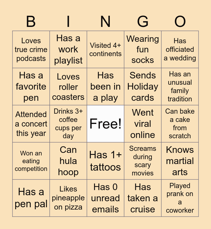 This bingo card has a free space and 27 words: Screams during scary movies, Has taken a cruise, Sends Holiday cards, Has 0 unread emails, Has a favorite pen, Visited 4+ continents, Has a work playlist, Won an eating competition, Went viral online, Knows martial arts, Attended a concert this year, Wearing fun socks, Has a pen pal, Likes pineapple on pizza, Has an unusual family tradition, Met a celebrity, Loves roller coasters, Has been in a play, Can hula hoop, Loves true crime podcasts, Can bake a cake from scratch, Has taken a cruise, Drinks 3+ coffee cups per day, Played prank on a coworker, Has 1+ tattoos, Has officiated a wedding and Has been scuba diving.