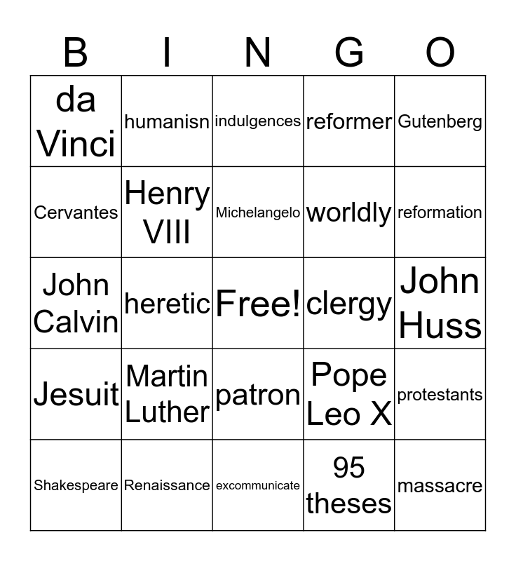 This bingo card has a free space and 24 words: Martin Luther, Renaissance, Michelangelo, Shakespeare, Gutenberg, da Vinci, Cervantes, humanisn, clergy, patron, worldly, John Calvin, Pope Leo X, protestants, Henry VIII, 95 theses, John Huss, indulgences, reformation, heretic, massacre, Jesuit, reformer and excommunicate.