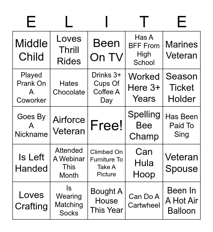 This bingo card has a free space and 74 words: First Time In Nashville, Army Veteran, Been On TV, Fluent In More Than One Language, Worked Here Less Than A Year, Has Green Eyes, Knows ASL, Can Bench Press 150+ Pounds, Loves Crafting, Fostered Or Adopted A Child, Moved In The Past 18 Months, Can Drive Stick, Drinks 3+ Cups Of Coffee A Day, Played Prank On A Coworker, Twin Or Triplet, Airforce Veteran, Only Child, Season Ticket Holder, Owns A Pet Other Than A Cat Or Dog, Goes By A Nickname, Hates Chocolate, Loves Thrill Rides, Has A BFF From High School, Bought A Car In The Last 18 Months, Been In A Hot Air Balloon, Has At Least 3 Siblings, Lived In Another Country, Read 10+ Books This Year, Has Officiated A Wedding, Has Been Scuba Diving, Marines Veteran, Oldest Child, Never Been To A Disney Park, Has A Podcast, Has A Birthday That's On A Holiday, Can Do A Cartwheel, Graduated Within The Last Ten Years, Double-Jointed, Enjoys Meeting New People, Met Partner Through Online Dating, Bought A House This Year, Is Wearing Matching Socks, Has Acted In A Play, Rides A Motorcycle, Navy Veteran, Middle Child, Never Been Camping, Attended A Webinar This Month, Attended 20+ Concerts, Has Been On A Cruise, Attended A High School Reunion, Has Taken Dance Lessons, Has Been Paid To Sing, Really Likes Glitter, Loves To Fish, Was Born Outside Of The Country, Climbed On Furniture To Take A Picture, Loves To Garden, Flown In A Helicopter, Veteran Spouse, Worked Here 3+ Years, Seen The Same Artist In Concert 3+ Times, Is Left Handed, Visited 3+ Continents, Spelling Bee Champ, Took Piano Lessons, Favorite Color Is Pink, Loves To Hunt, Can Hula Hoop, Loves Asparagus, Played A Sport In College, Lets Their Pets Sleep In Their Bed, Met A Celebrity and Seen At Least 5 Artists In Nashville.