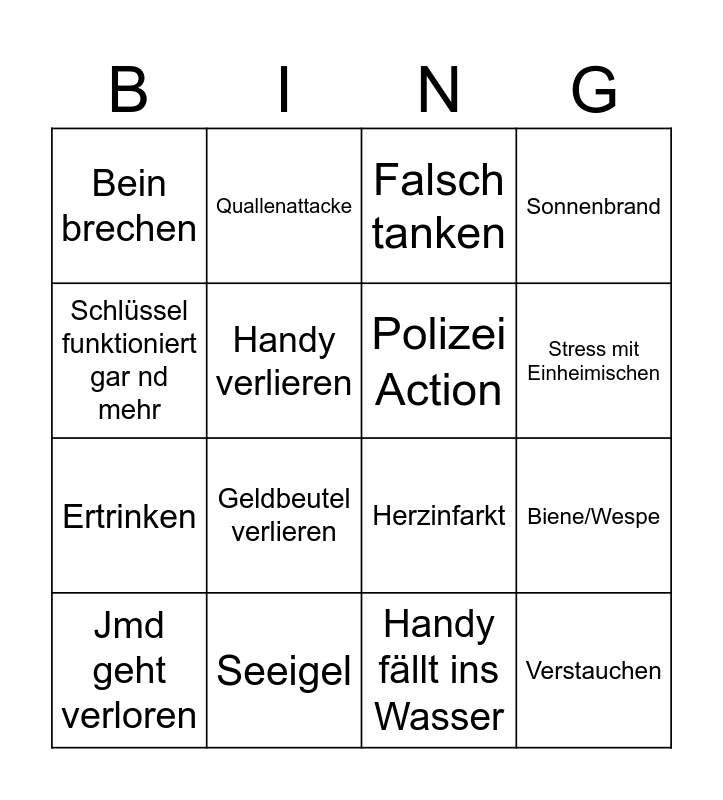 This bingo card has 16 words: Seeigel, Biene/Wespe, Falsch tanken, Bein brechen, Ertrinken, Quallenattacke, Herzinfarkt, Handy fällt ins Wasser, Schlüssel funktioniert gar nd mehr, Handy verlieren, Jmd geht verloren, Sonnenbrand, Geldbeutel verlieren, Stress mit Einheimischen, Polizei Action and Verstauchen.