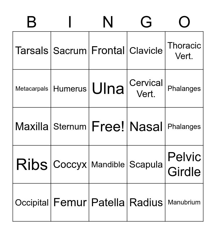 This bingo card has a free space and 32 words: Radius, Carpals, Sternum, Fibula, Ribs, Humerus, Thoracic Vert., Pelvic Girdle, Sacrum, Lumbar Vert., Ulna, Frontal, Parietal, Temporal, Nasal, Zygomatic, Occipital, Maxilla, Mandible, Coccyx, Scapula, Metatarsals, Phalanges, Femur, Manubrium, Clavicle, Cervical Vert., Metacarpals, Tarsals, Patella, Tibia and Phalanges.