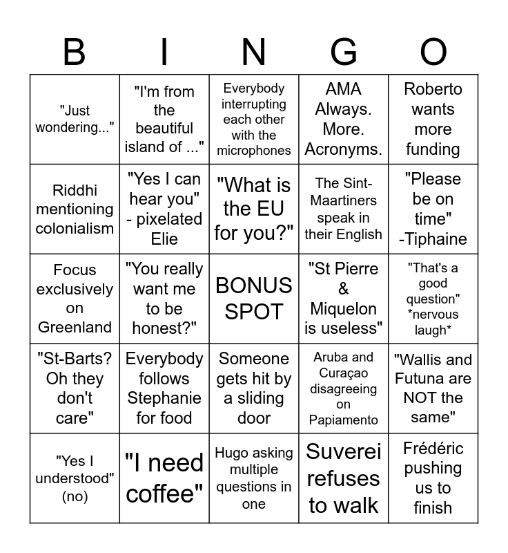 This bingo card has a free space and 24 words: Everybody follows Stephanie for food, "I need coffee", "What is the EU for you?", "Yes I understood" (no), Roberto wants more funding, "Just wondering...", Riddhi mentioning colonialism, "I'm from the beautiful island of ...", "St Pierre & Miquelon is useless", Someone gets hit by a sliding door, The Sint-Maartiners speak in their English, Focus exclusively on Greenland, Aruba and Curaçao disagreeing on Papiamento, "Wallis and Futuna are NOT the same", "Yes I can hear you" - pixelated Elie, Suverei refuses to walk, "That's a good question" *nervous laugh*, Everybody interrupting each other with the microphones, "Please be on time" -Tiphaine, "You really want me to be honest?", Frédéric pushing us to finish, "St-Barts? Oh they don't care", AMA Always. More. Acronyms. and Hugo asking multiple questions in one.