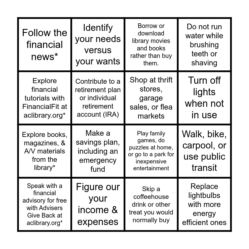 This bingo card has 18 words: Explore financial tutorials with FinancialFit at aclibrary.org*, Figure our your income & expenses, Borrow or download library movies and books rather than buy them., Do not run water while brushing teeth or shaving, Explore books, magazines, & A/V materials from the library*, Identify your needs versus your wants, Play family games, do puzzles at home, or go to a park for inexpensive entertainment, Turn off lights when not in use, Follow the financial news*, Make a savings plan, including an emergency fund, Skip a coffeehouse drink or other treat you would normally buy, Walk, bike, carpool, or use public transit, Speak with a financial advisory for free with Advisers Give Back at aclibrary.org*, Contribute to a retirement plan or individual retirement account (IRA), Shop at thrift stores, garage sales, or flea markets, Replace lightbulbs with more energy efficient ones, Make a savings plan, including an emergency fund and Contribute to a retirement plan or individual retirement account (IRA).