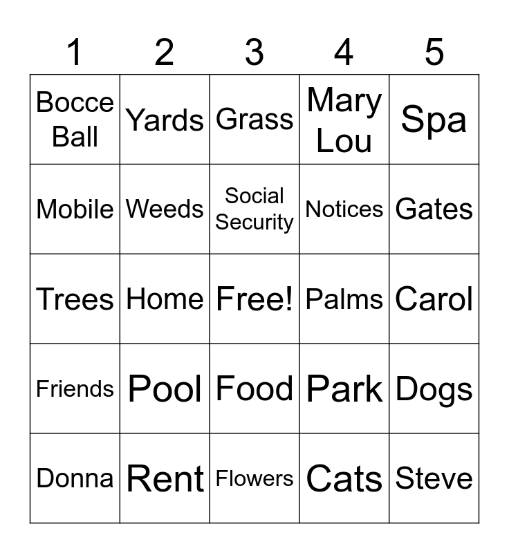 This bingo card has a free space and 24 words: Pool, Rent, Social Security, Donna, Spa, Bocce Ball, Mobile, Yards, Palms, Food, Notices, Trees, Park, Dogs, Weeds, Cats, Carol, Grass, Gates, Home, Steve, Friends, Mary Lou and Flowers.