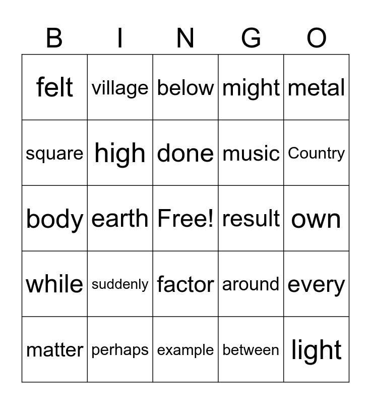 This bingo card has a free space and 24 words: suddenly, perhaps, done, matter, metal, felt, square, village, result, factor, music, body, around, every, high, between, own, below, Country, earth, light, while, might and example.