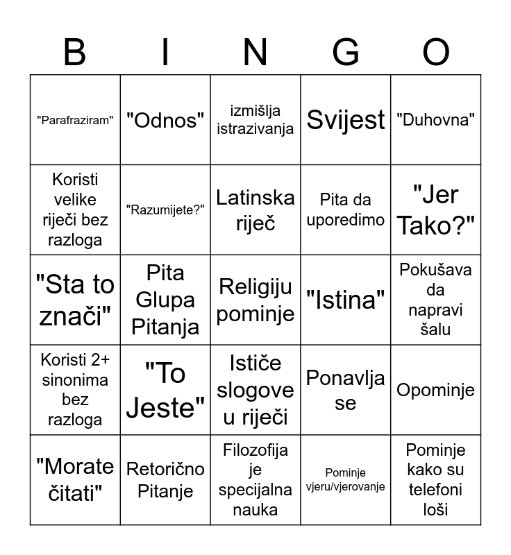 This bingo card has 25 words: "To Jeste", Filozofija je specijalna nauka, Latinska riječ, "Morate čitati", "Duhovna", "Parafraziram", Koristi velike riječi bez razloga, "Odnos", "Istina", Ističe slogove u riječi, Pita da uporedimo, "Sta to znači", Ponavlja se, Opominje, "Razumijete?", Pominje kako su telefoni loši, Pokušava da napravi šalu, izmišlja istrazivanja, "Jer Tako?", Pita Glupa Pitanja, Religiju pominje, Retorično Pitanje, Koristi 2+ sinonima bez razloga, Svijest and Pominje vjeru/vjerovanje.