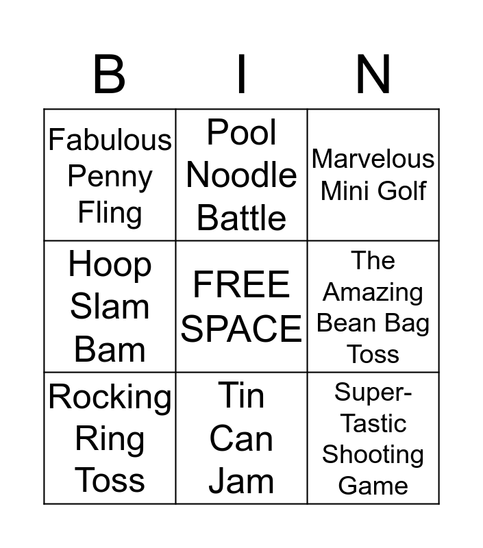 This bingo card has a free space and 8 words: The Amazing Bean Bag Toss, Marvelous Mini Golf, Pool Noodle Battle, Rocking Ring Toss, Fabulous Penny Fling, Super-Tastic Shooting Game, Hoop Slam Bam and Tin Can Jam.