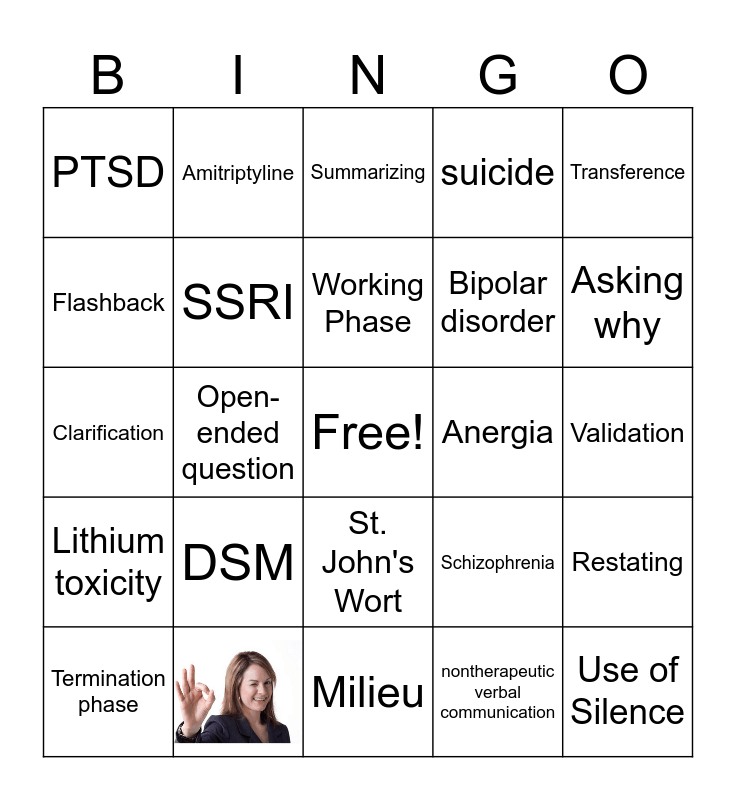 This bingo card has 2 images, a free space and 23 words: DSM, Milieu, Working Phase, Termination phase, Transference, PTSD, Flashback, Amitriptyline, Anergia, St. John's Wort, Bipolar disorder, Clarification, Schizophrenia, Restating, SSRI, Validation, Summarizing, Asking why, Open-ended question, Use of Silence, Lithium toxicity, suicide and nontherapeutic verbal communication.