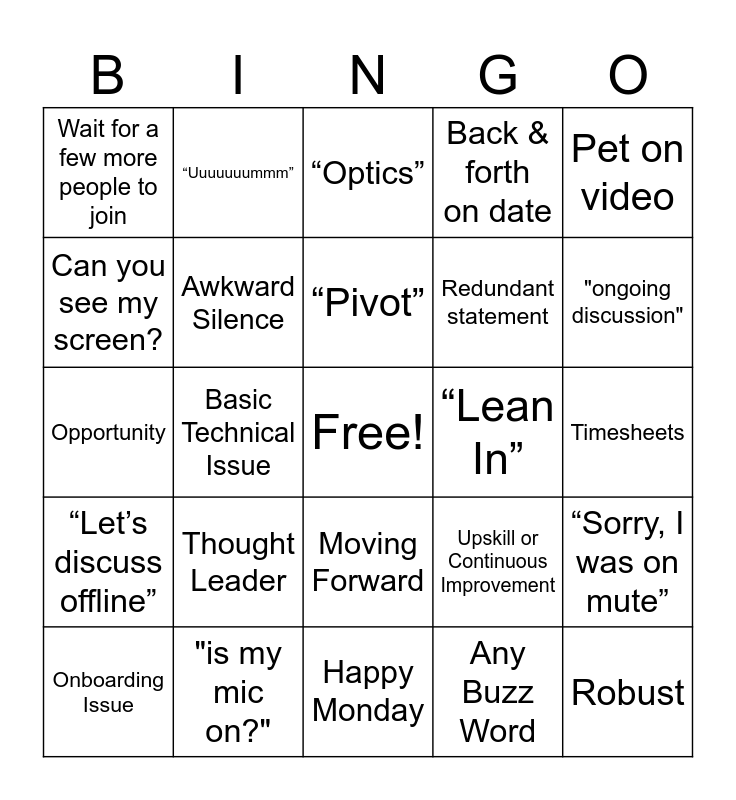 This bingo card has a free space and 32 words: Any Buzz Word, Unmuted Mic, Basic Technical Issue, Not knowing common acronym, “Let’s discuss offline”, Awkward Silence, Pet on video, “Sorry, I was on mute”, “Uuuuuuummm”, “I’ll give you X minutes back”, “Pivot”, “Optics”, “Pain Point”, “Circle Back”, “Lean In”, “Moving Parts”, Onboarding Issue, Opportunity, Moving Forward, Thought Leader, Upskill or Continuous Improvement, Feedback, Timesheets, "is my mic on?", Robust, Back & forth on date, Redundant statement, Can you see my screen?, Wait for a few more people to join, Happy Monday, Happy Friday and "ongoing discussion".