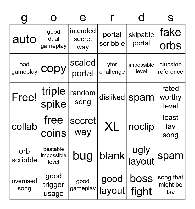 This bingo card has 36 words: blank, bug, good layout, bad gameplay, collab, disliked, copy, good gameplay, skipable portal, ugly layout, clubstep reference, portal scribble, spam, triple spike, yter challenge, auto, orb scribble, spam, Free!, intended secret way, random song, free coins, XL, secret way, noclip, good dual gameplay, impossible level, good trigger usage, scaled portal, fake orbs, song that might be fav, overused song, least fav song, rated worthy level, beatable impossible level and boss fight.