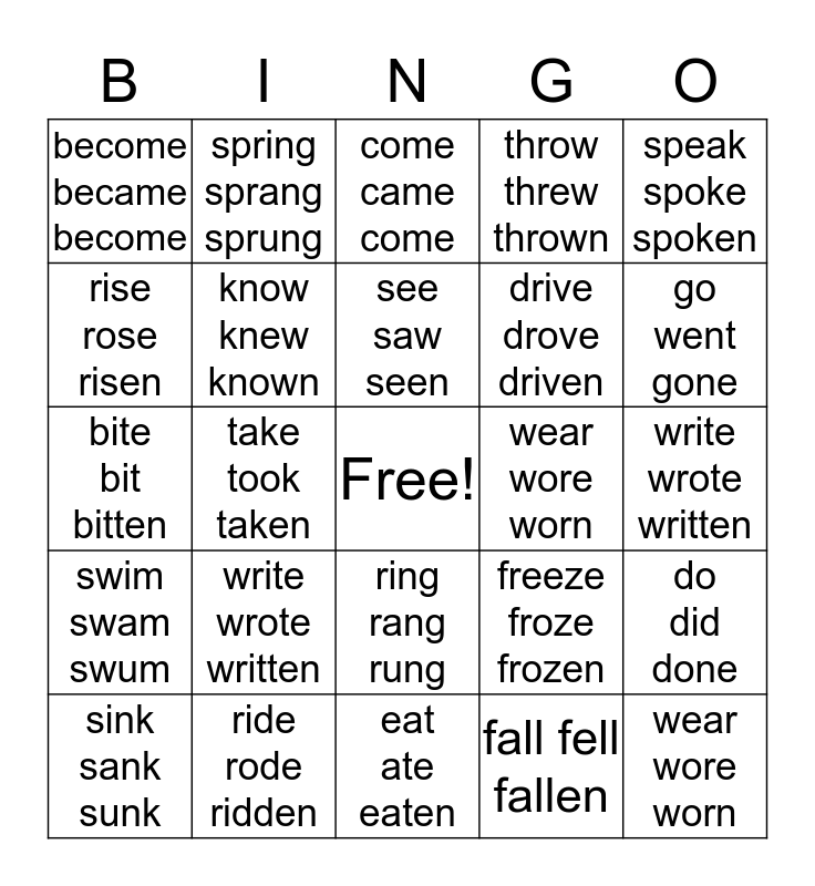 This bingo card has a free space and 41 words: break broke broken, bite bit bitten, begin began begun, know knew known, ride rode ridden, ring rang rung, see saw seen, show showed shown, speak spoke spoken, swim swam swum, take took taken, throw threw thrown, wear wore worn, write wrote written, wear wore worn, write wrote written, is was/were been, become became become, choose chose chosen, come came come, do did done, drink drank drunk, eat ate eaten, drive drove driven, give gave given, forget forgot forgotten, fall fell fallen, grow grew grown, go went gone, hide hid hidden, sing sang sung, spring sprang sprung, sink sank sunk, forgive forgave forgiven, freeze froze frozen, rise rose risen, steal stole stolen, wake woke woken, fly flew flown, lie lay lain and drawn drew drawn.
