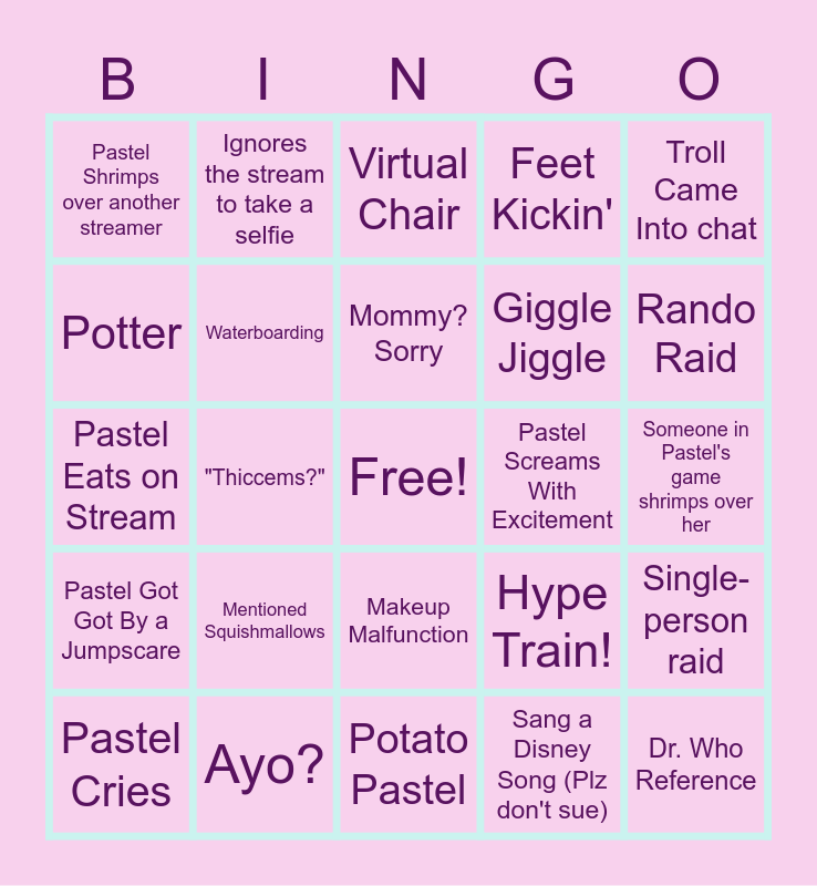 This bingo card has a free space and 24 words: Pastel Cries, Mentioned Squishmallows, Mommy? Sorry, Sang a Disney Song (Plz don't sue), Troll Came Into chat, Pastel Shrimps over another streamer, Ignores the stream to take a selfie, Virtual Chair, Pastel Screams With Excitement, Someone in Pastel's game shrimps over her, Pastel Eats on Stream, Waterboarding, Hype Train!, Single-person raid, Potter, Ayo?, Potato Pastel, Feet Kickin', Rando Raid, Pastel Got Got By a Jumpscare, "Thiccems?", Makeup Malfunction, Giggle Jiggle and Dr. Who Reference.