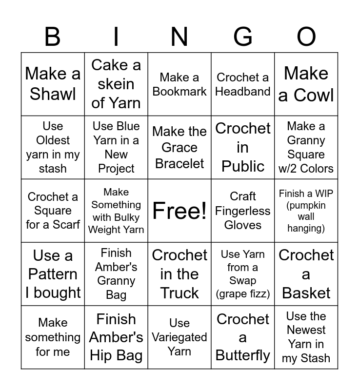 This bingo card has a free space and 24 words: Finish Amber's Granny Bag, Finish Amber's Hip Bag, Make the Grace Bracelet, Make something for me, Make a Cowl, Make a Shawl, Use Oldest yarn in my stash, Cake a skein of Yarn, Craft Fingerless Gloves, Crochet in the Truck, Crochet in Public, Crochet a Square for a Scarf, Use Yarn from a Swap (grape fizz), Crochet a Basket, Use Blue Yarn in a New Project, Crochet a Butterfly, Finish a WIP (pumpkin wall hanging), Make a Bookmark, Make a Granny Square w/2 Colors, Make Something with Bulky Weight Yarn, Use the Newest Yarn in my Stash, Use a Pattern I bought, Crochet a Headband and Use Variegated Yarn.