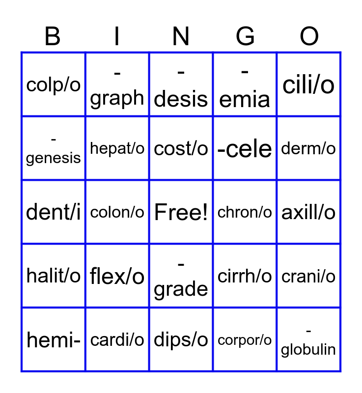 This bingo card has a free space and 100 words: atlant/o, audi/o, axill/o, axi/o, bateri/o, balan/o, blephar/o, brachi/o, brady-, brom/o, bucc/o, calcane/o, -carcinoma, cardi/o, cardiomy/o, caud/o, -cele, -centesis, cephal/o, cerumin/o, cervic/o, -chalasia, cheil/o, chondr/o, chrom/o, chron/o, cili/o, cirrh/o, -cision, -coagulation, colon/o, colp/o, con-, coron/o, corpor/o, cost/o, crani/o, crin/o, cutane/o, cyan/o, dacry/o, delt/o, dent/i, -derma, derm/o, -desis, dextr/o, dia-, digit/o, dips/o, dist/o, dros/o, -dynia, ec-, echo-, -ectomy, -edema, ef-, -emesis, -emia, -emphraxis, -emulsification, endo-, enter/o, eosin/o, epi-, erythemat/o, eschar/o, exanthemat/o, exo-, fissur/o, flex/o, fluor/o, fornic/o, foss/o, galact/o, gastr/o, -genesis, ger/o, gingiv/o, glauc/o, -globulin, gluc/o, -grade, -gram, -graph, -graphy, gravid/o, gyn/e, halit/o, halluc/o, hedon/o, hem/o, hemi-, hepat/o, herni/o, hiat/o, hidr/o, hist/o and home/o.