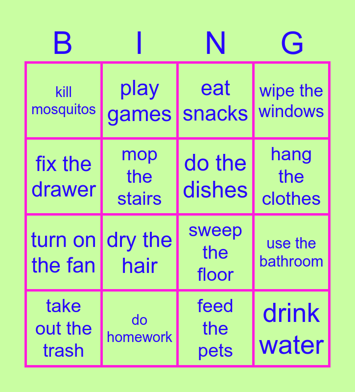 This bingo card has 16 words: do homework, use the bathroom, eat snacks, kill mosquitos, turn on the fan, play games, sweep the floor, feed the pets, fix the drawer, mop the stairs, take out the trash, wipe the windows, dry the hair, hang the clothes, do the dishes and drink water.
