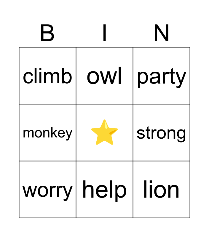 This bingo card has a free space and 8 words: strong, party, owl, worry, climb, lion, monkey and help.