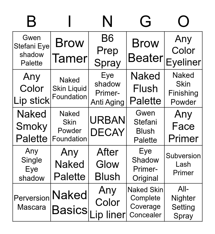 This bingo card has a free space and 24 words: Any Naked Palette, Naked Basics, Eye shadow Primer- Anti Aging, Perversion Mascara, Any Color Eyeliner, Gwen Stefani Eye shadow Palette, Any Color Lip stick, Brow Tamer, Gwen Stefani Blush Palette, After Glow Blush, Naked Flush Palette, Naked Smoky Palette, Eye Shadow Primer- Original, Subversion Lash Primer, Naked Skin Liquid Foundation, Naked Skin Complete Coverage Concealer, Any Face Primer, B6 Prep Spray, Naked Skin Finishing Powder, Naked Skin Powder Foundation, All- Nighter Setting Spray, Any Single Eye shadow, Brow Beater and Any Color Lip liner.