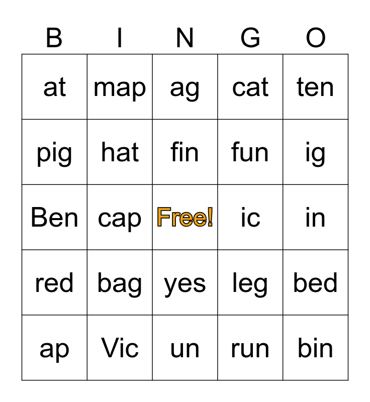 This bingo card has a free space and 29 words: ap, ad, cap, sad, at, ag, hat, bag, ic, Vic, in, bin, un, run, ig, big, yes, red, ten, Ben, leg, Mel, fun, pig, cat, map, bed, fin and rat.