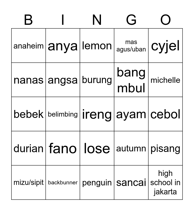 This bingo card has a free space and 24 words: fano, backbunner, burung, mizu/sipit, cyjel, anaheim, nanas, anya, ayam, lose, bang mbul, bebek, autumn, pisang, angsa, sancai, cebol, lemon, michelle, belimbing, high school in jakarta, durian, mas agus/uban and penguin.