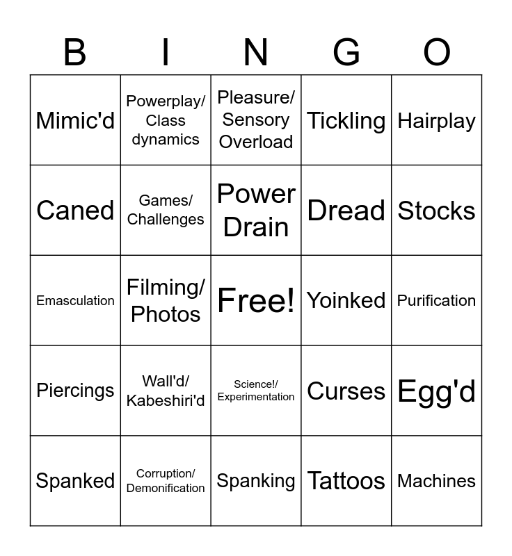This bingo card has a free space and 24 words: Wall'd/ Kabeshiri'd, Corruption/ Demonification, Power Drain, Spanked, Hairplay, Mimic'd, Caned, Powerplay/ Class dynamics, Yoinked, Science!/ Experimentation, Dread, Emasculation, Curses, Egg'd, Games/ Challenges, Tattoos, Purification, Pleasure/ Sensory Overload, Stocks, Filming/ Photos, Machines, Piercings, Tickling and Spanking.