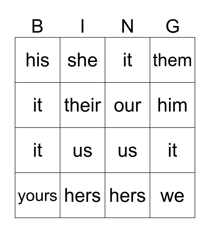 ⚠ This card has duplicate items: they (2), her (4), their (2), our (2), it (4), them (3), hers (2), us (3), theirs (2), your (2), yours (2)