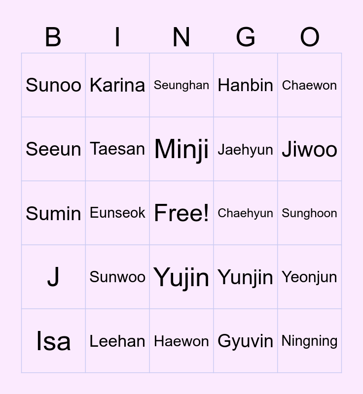This bingo card has a free space and 24 words: Isa, Sunwoo, Minji, Gyuvin, Chaewon, Sunoo, Karina, Seunghan, Chaehyun, Sunghoon, Sumin, Taesan, Yunjin, Yeonjun, Seeun, Leehan, Haewon, Hanbin, Jiwoo, J, Eunseok, Yujin, Jaehyun and Ningning.