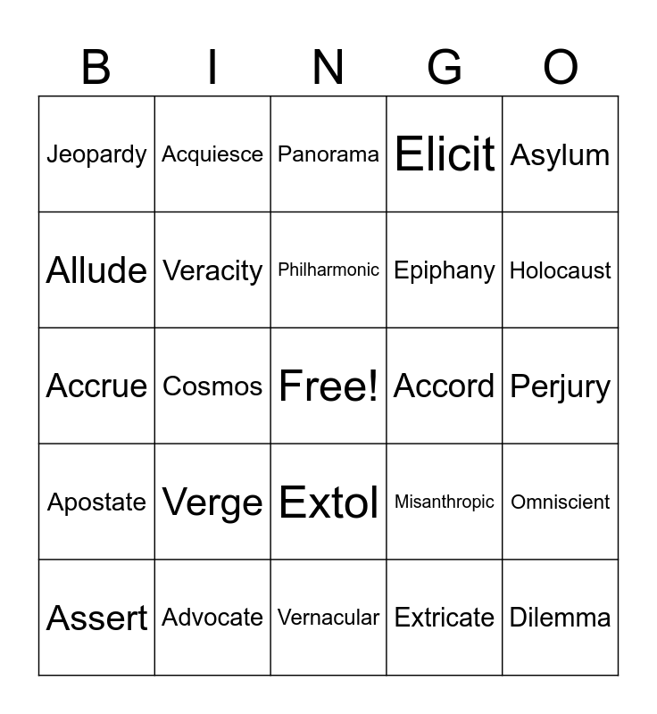 This bingo card has a free space and 24 words: Verge, Advocate, Philharmonic, Assert, Asylum, Jeopardy, Allude, Acquiesce, Accord, Extol, Epiphany, Accrue, Misanthropic, Omniscient, Veracity, Extricate, Perjury, Panorama, Holocaust, Cosmos, Dilemma, Apostate, Elicit and Vernacular.